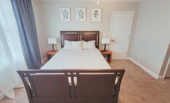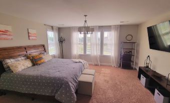 -Master King bedroom with great en-suite bathroom. All toiletries and plush linens provided. Plush Purple mattress with cooling, breathable linens. Plenty of pillows & blankets. 55' Smart Tv and walk-in closet.