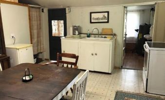 The whole cabin and lot is yours complete with a small kitchen and bathroom with shower. Two small bedrooms. A sun porch looking out towards the field. There’s a fire pit and picnic table.