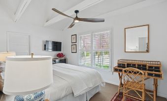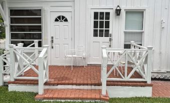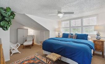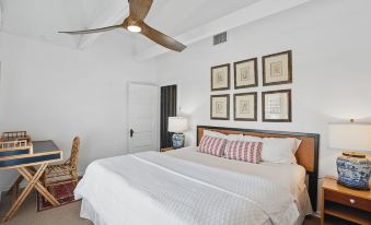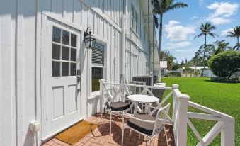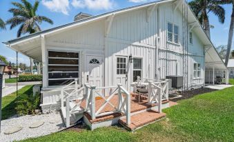 Upstairs is one of five art-filled, comfort priorities rental opportunities on a magnificently rebuilt Old Naples Estate c.1910. One can tell this property is a dedicated Butterfly Migration Station as they look out the window over the beautiful grounds and spy on the butterflies fluttering. Located two blocks from the Gulf of Mexico and Naples Pier and within walking distance of everything 5th Avenue and 3rd Street have to offer. The private entrance to the stairs brings you to a newly renovated, magical spot. Comfortable seating arrangement, full kitchen with marble counters forming a seating bar, all new equipment, two king bedrooms, and a full bathroom with a tub off the kitchen. A stackable washer and dryer, two smart televisions, a grill, a cooler, an umbrella, chairs, and towels make beach life easy.