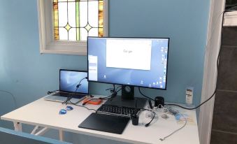 * Workspace is a large (four-foot) table, equipped with a 27" Dell UltraSharp InfinityEdge Widescreen Monitor, and powerstrip. Bring your laptop and HDMI connection cable. 1-GB high-capacity and high-speed Verizon FiOS fiber-optic WiFi.