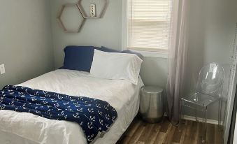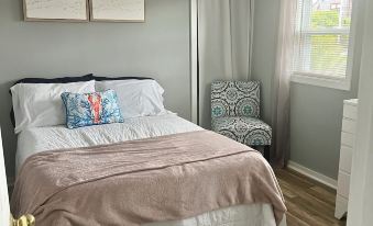 There are two bedrooms, each with one full bed, and one full bathroom. The TV room has 2 pull out couches that each have a full sized bed, newly replaced windows that let in a nice breeze and lots of light and an Apple TV. There is newly installed central AC for those hot summer days. You have options for outdoor relaxing - there is a front deck with chairs and a coffee table and a large backyard with tables, lounge chairs, a grill and yard games for you to enjoy.