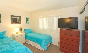 There is a large living room with 2 couches and a wall mounted flat screen TV, perfect for relaxing after a long day on the sand. The master bedroom has a queen bed and an en suite bath with a walk-in shower. The first guest bedroom has a queen bed and a full bed, the second guest bedroom has 2 twin beds. These guest bedrooms share a full bath in the hall with a tub/shower combination and an exterior access door for après beach clean-up.
