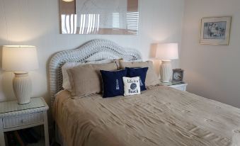 The Master Bedroom features two oceanfront views with a large window overlooking the beach and a sliding glass door to the balcony. Master includes a queen size bed, private bath (en suite), large closet, dresser, and cable TV. Fully renovated bathroom.