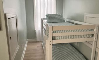 3 bedrooms: 1 bunk bed 1 single bed 1 queen bed and 1 king bed