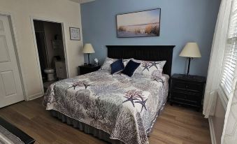 The master suite has a very comfortable king size bed. A handsomely decorated full bath suite adjoins the master bedroom, which also has a flat screen TV and a full walk-in closet.
