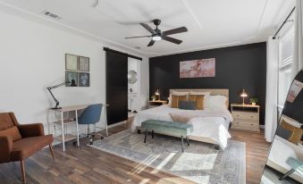 ♛ Master Bedroom: King-Size Bed, Workspace (Desk, Chair, Lamp), Ensuite Bathroom