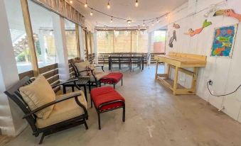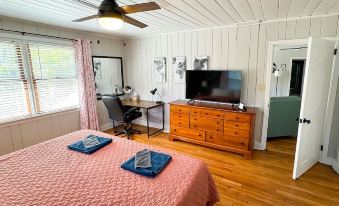 The kitchen leads into the open concept living and dining room where the whole family can spread out. A 65” Smart Roku TV has local channels and is wifi-equipped, ready for your streaming service subscriptions. The dining room has a bar area with plenty of tumblers and stemware to enjoy your favorite adult beverages while you play your favorite tunes on the Bluetooth stereo. The dining room table can seat up to 10 (extra chairs provided). A wide selection of books, magazines, and board games can be found to pass the time. The home’s wifi is 1gb Fiberoptic and that can power all of your devices.