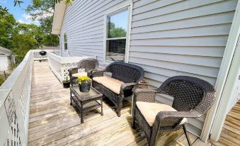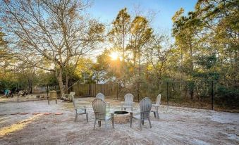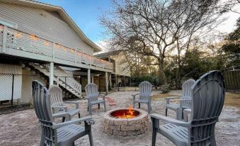 Plenty of parking (up to 6 cars) in the front of the house. Ample space under the home to store canoes, kayaks, and all your beach gear. We offer a selection of beach chairs and toys for a day on the sand. When you come home, rinse off and rejuvenate in the outdoor shower. Plenty of places to relax outdoors. Cozy up with good book and a cup of coffee on the upper deck. Have dinner outdoors or play games around the big patio table inside the HUGE screened porch. Enjoy an evening under the stars as you toast marshmallows and unwind around the custom stone the firepit. The backyard also has a 6’ fence, perfect for the dogs.
