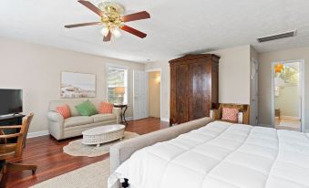 Master Suite (upstairs): King bed, sleeper sofa, twin air mattress, sitting area, water views, and desk