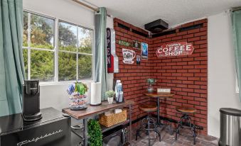 - Coffee Bar: Keurig coffee maker with K-cups, microwave, mini fridge, and toaster
