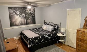 The master bedroom features a king sized bed with topper, closet, two ceiling fans, iron and ironing board along with an extra pillows and blanket.