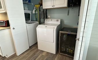 The kitchen contains all of the amenities of home including a dishwasher, gas stove and oven, stainless steel refrigerator with filtered water. There is a full washer / dryer and an additional separate beverage refrigerator.