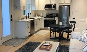 The suite is an open concept living room, dining room with full kitchen. One bedroom with a Queen size bed with large closet and a three piece bathroom. In suite laundry. Large sliding glass door to covered deck with table, bbq and loungers.About pets:No pets allowed.About checkOut:Check out before 11:00 AM.About children:Adults only.About customRules:No, vaping is not allowed.About checkIn:Check in after 3:00 PM.About smoking:Smoking is not permitted.About minBookingAge:Minimum age to rent: 21.About events:No events allowed.