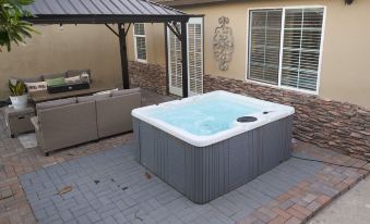 Brand new modern single-story Anaheim home with a spa, arcade games, office corner, pack-n-play, high chair, and accessibility.