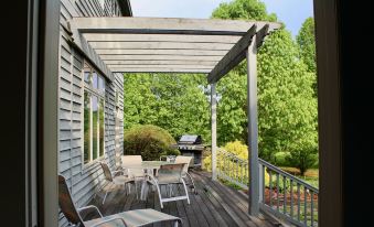 Imagine a spacious, well-equipped kitchen and dining room, plus outdoor deck dining and grill space, to allow you and those you love to relax and celebrate together indoors and out on this working family farm. A guest favorite: the council ring made of ancient stone benches with a firepit for your family to enjoy sunset, fire, moon and stars...all within view of the house. Upstairs in the master suite is a jetted tub for two with a skylight above, with a shower and a private stargazing or sunbathing deck adjacent. New: a play set with a swing for children.