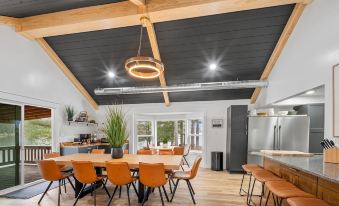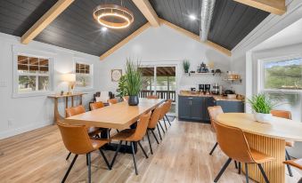 (Main Floor) walking through the front door you enter into a large dining room that seats all 16 guests! 18 seats total. A coffee bar with 2 coffee pots to kick off everyone's morning right! The slider off the dinning opens up to a massive covered deck to enjoy the lake no matter the weather. The modern kitchen has everything needed to cook amazing meals with a double refrigerator to hold all your food. This home has an oversized living room with 2 sectionals, a shuffleboard table, a couch overlooking a wood burning fireplace. Step outside from the living room onto a huge 16x28 deck with picnic tables to bring your meals to the outdoors or just to relax in the sun. Sleeping on the main floor has 2 - queen bedrooms, and 2 full baths. A couple steps down and you walk into the kid bunk room, 2 bunk beds with trundles sleeping 6, a couch, tv, & arcade games. Go upstairs from the bunk room and you will find a second kid room with 2 twin beds.