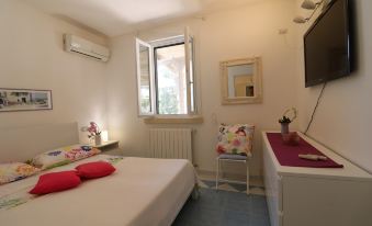 The true charm of Villa Patrizia reveals itself outdoors: a wide garden filled with olive trees and palm trees leads to a covered veranda, where a large table invites you to enjoy relaxed meals in the open air. Guests can also take advantage of a barbecue and a traditional wood-fired oven, perfect for outdoor dinners and summer evenings. On-site parking adds to the convenience, especially for those arriving by car.