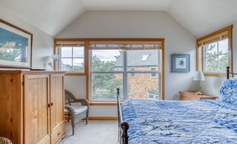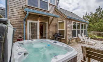 This Cape-Cod-style home is a short walk from both the beach at Haystack Rock and a Cape Kiwanda favorite, the Pelican Pub. With a private hot tub, a large deck with a barbecue, and built-in seating, BeachLover’s Getaway is a great place to spend time outdoors. But you’ll feel equally at home indoors, where vaulted ceilings, sleek flooring, inset lighting, and contemporary furnishings create a relaxed atmosphere. The living room’s vaulted ceiling and multiple windows make the room bright and open; you and your guests will enjoy lounging on the comfy sofas in front of the TV and gas double fireplace. This home also has cable TV and high-speed internet for all to enjoy. The dining room benefits from the other side, letting you feast by firelight on meals from the fully equipped galley kitchen. Upstairs, two spacious queen bedrooms, one with bunk beds, have vaulted ceilings and share a pretty bathroom.