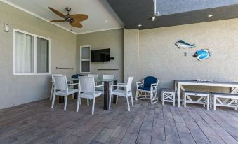 Upon entering the house, you will find a very spacious, and open, living room. Writing desk if needed and brand new leather furniture looking on to a big screen Television. The house boasts 4 large bedrooms, each with its own beautiful ensuite and KING SIZED BEDS. The kitchen is fabulously designed with granite counter tops, stainless steel appliances and a very unique indoor/outdoor kitchen. Simply open the bi-folding glass window and serve directly out onto the granite breakfast bar... giving you that outdoor atmosphere. We have also supplied, for your convenience, an outdoor beer/cold drink fridge just outside the large glass patio door leading from the house to the covered terrace out by the pool.