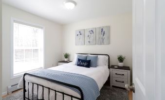 The house has four bedrooms, each with comfortable beds and plenty of closet space for your belongings. The master bedroom features a king-size bed and an en-suite bathroom, while the two other bedrooms on this floor each have queen-size beds and share a second full bathroom. The fourth bedroom, in the finished basement, features a queen bed with an adjacent full bathroom.