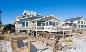 This two-story home offers the best of Pawleys Island, combining stunning ocean views with marsh access. With spacious indoor and outdoor areas, Laughin Place is most known for its family gatherings. This rental is for the Upstairs fully contained two bedroom apartment. There is a living area with an efficiency kitchen: full-size refrigerator, 2-burner ceramic cooktop, convection oven, microwave, Keurig, and coffee pot. Additionally, for your convenience, the newly added covered creek dock with a floating platform is perfect for fishing and crabbing. Rooftop deck with breathtaking panoramic views, shaded ground-level area perfect for lounging, or enjoy the sun right on the beach! Convenient for remote work with plenty of quiet spaces. This lovely 2-bedroom rental is also available to rent many other ways; during most of the spring, fall and winter, you can rent the home as a one-bedroom suite or as a 5-bedroom on the main level. May-September, Laughing Place is ONLY available as a 7 bedroom home.
