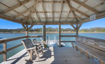AMENITIES: Covered dock on the creek with a floating platform, stairs that lead all the way to the Widows Walk deck on top of the house for ocean to marsh views, washer dryer, internet access, luxury linen and towels and large deck/patio.