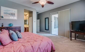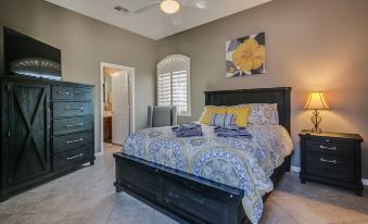 The master bedroom with ensuite bathroom and walk-in closet, has a king size bed, night stand, lamp, dresser, remote ceiling fan and a 43" flat screen TV for lounging the day away. The ensuite master bathroom has a double sink vanity, separate water closet, a garden tub and standing shower to wash all your cares away. The second bedroom has a queen size bed, night stand, lamp, remote ceiling fan, dresser, a flat screen TV and large closet. The third bedroom has a queen size bed, night stand, lamp, remote ceiling fan, dresser, flat screen TV and double closets. The second bathroom, with double sink vanity, tub and shower combo is conveniently situated between the second and third bedrooms. There is a half bath available as well for guest use in the home. The attached casita with separate outside entrance features a fourth bedroom with ensuite bathroom. The bedroom includes queen size bed, night stand, lamp, remote ceiling fan, sitting chair, five drawer gentleman's chest and a flat screen TV. Ensuite bathroom has a single sink vanity, tub and shower combo with a small closet.