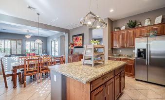 The kitchen lies off of the game room and is fully equipped with coffee maker, coffee grinder, toaster, and a blender for mixing up your morning smoothie or a batch of margaritas to enjoy poolside. The kitchen includes a large double door refrigerator and freezer, 4 burner gas range, oven and broiler, microwave and dishwasher. Prepare your favorite meals using prep space on the large island including granite counter tops throughout the kitchen. Dinnerware, silverware and glasses provide place settings for up to 8 guests. All the cookware, bakeware, and utensils you would have in your own kitchen can be found in your home away from home. Sit down to your delicious meal in the open dining area off the kitchen including a dining table and 8 chairs. A cabinet buffet is in the dining room, inside it you will find placemats for the dining table and board games for friendly competition after dinner.