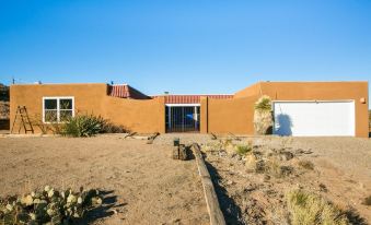Art and Nature-themed custom home in Placitas on acre with spectacular views of Jemez Mountains and mesas. Gigabit internet w/up to 1200 Mbps downloads. Courtyard with outdoor seating and chimenea. Beautiful sunsets from wraparound veranda. Large, well-equipped kitchen & dining area with brick floors, cozy Wood Stove. Property is 40 minutes to Santa Fe and 35 minutes to the Albuquerque airport. Hot water doesn't run out with tankless water heaters.About pets:Pets allowed: dogs less than 50 lbs per pet (limit 2 pets total).Guests are allowed to bring up to two dogs..About checkOut:Check out before 11:00 AM.About children:Children allowed: ages 0-17.About customRules:Do not to start a fire on last day. DO NOT leave fire burning in either the fireplace or woodstove. Charcoal grill coals are completely out..No Smoking or vaping: This is a smoke-free home. Any lingering smoke odor in the house after departure will cause loss of damage deposit.,No parties with numerous attendees not part of the booking are allowed..About checkIn:Check in after 4:00 PM.About smoking:Smoking is not permitted.About minBookingAge:Minimum age to rent: 21.About events:No events allowed.