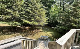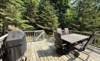 Large wrap-around deck with BroilKing grill and 6-person dining table in warm season. Off the steps, access to a large side yard with horseshoes/fire. Hike up the hill for a great view!