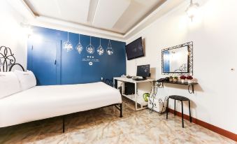 The stay was really good. The service was really very good (I was given a carton of water for 3 days hahaha). The facilities were also okay. The building is old; however, it is fairly clean, though it smells damp. The floor was sticky too. The blue wall was also not clean, yet the bed is attached to it.