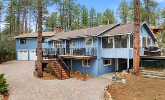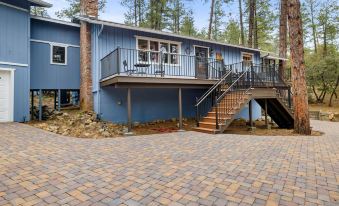 Nestled in the Ponderosa Pines in The Prescott National Forrest is our spectacular 3bdr home with 2.5 baths just waiting on you to start your vacation. Sleeps 8. Upgraded kitchen with granite countertops Extra large great room with bumper pool, wet bar, poker table and a large 60" TV. Living Room has a terrific fireplace to relax by and entertain guest. Large wood deck has patio table and chairs to sit back and drink your morning coffee and smell the sweet pines. Reading room attached to Master bedroom provides lots of sunlight and quiet so you can sink your teeth into the latest read or soak your bones in our jacuzzi bath. Park your vehicle in our 3-car garage which also has a Ping Pong table. Outside you can hike one of our many trail heads or ride that special horse. Rent a bicycle or motorcycle and ride the hills and curves. Explore our Forrest and find one of Prescotts best kept secrets - a 90 foot waterfall just half a mile from Wolf Creek or swim in our swimming holes. Take in the breath-taking views of our mountains and breath in the refreshing scent of our Ponderosa Pines. Our home is located just 5 miles South of downtown Prescott. Take a stroll downtown, shop our many boutiques and visit our terrific restaurants. We want your vacation to be the best and keeps you coming back year after year.About pets:Pets allowed: dogs and cats less than 50 lbs per pet (limit 2 pets total).About checkOut:Check out before 11:00 AM.About children:Children allowed: ages 0-17.About customRules:Parking in garage is allowed only in double door section. Single door section is reserved for owners personal items. Please be respective..About smoking:Smoking is not permitted.Smoking is allowed outside on deck..About events:No events allowed.