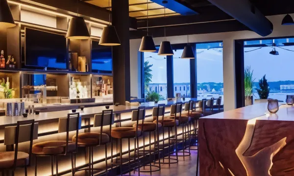 Daily Mandatory Charge includes: Destination Marketing Fee. Situated along the waterfront of Portland, Maine, our hotel is in the heart of downtown. Explore the unique neighborhood with our complimentary Canopy bikes and find dozens of award-winning restaurants, shops, galleries, and trails within a mile. Our rooftop bar, Luna, features fantastic views of the working waterfront with a seasonal locally sourced menu of small plates and craft cocktails. Salt Yard Cafe and Bar provides all day dining from creative breakfast and pastries, fresh and healthy lunch choices, and classic cocktails with a local twist. For special events and large gatherings and we offer a private dining room and state of the art function spaces.