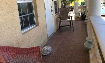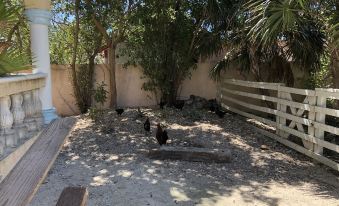 The neighbors have a friendly shaggy dog who patrols the property, and there is a family of hens and a rooster who live on the back wall of the garden. If you are afraid of dogs or chickens this is not the place for you!