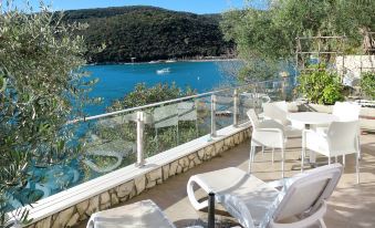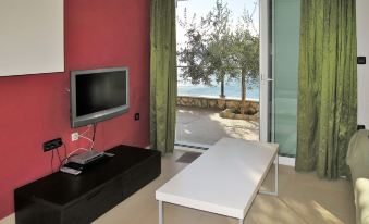 Apartment block "Milevoj", 3 storeys. 200 m from the centre of Rabac, 5 km from the centre of Labin, on a slope, in the residential district, 50 m from the sea, 250 m from the beach. For shared use: property. Shop 100 m, restaurant 20 m, bicycle rental 300 m, pebble beach 250 m, rocky beach 50 m, indoor swimming pool 300 m. "Milevoj (RAC157)", 2-room apartment 49 m2, on the ground floor. Modern furnishings: living/dining room with 1 double sofabed (160 cm), dining table, satellite TV and air conditioning. Exit to the balcony. 1 room with 1 french bed. Open kitchen (oven, 4 ceramic glass hob hotplates, electric coffee machine). Shower/WC, sep. WC. No heating option. Terrace 18 m2. Terrace furniture, deck chairs (2). View of the sea. Facilities: Internet (WiFi, free). Reserved parking (1 car). Please note: fridge without freezer, non-smokers only. Private entrance.