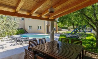 Krnica 22 km from Pula: 2-family house "Ana". In the hamlet Beloći 7 km from the centre of Krnica, 7 km from the centre of Barban, 26 km from the centre of Rabac, in a quiet, sunny position, 4 km from the sea, 4 km from the beach. For shared use: property 800 m2 (fenced), garden with lawn and plants. Private: swimming pool angular, heated (7 x 4 m, depth 140 cm, seasonal availability: 01.Apr. - 01.Nov.) with internal staircase and salt-electrolysis pool-cleaning system. Outdoor shower, terrace (20 m2), garden furniture, barbecue (slide, swing), pool maintenance by the owner/gardener. In the house: internet access, trampoline, storage room for bicycles. Available: bicycles (4). Parking at the house on the premises. E-charging station. Shop 2 km, supermarket 7 km, restaurant 3 km, bus stop 1.4 km, pebble beach 4 km, rocky beach 4 km, public bathing area 16 km. Riding stable 500 m, walking paths from the house 50 m, cycle lane 100 m. Nearby attractions: Amusement park 6 km. Please note: airfield 20 km from the property. For shared use: trampoline, bicycles (4), storage room for bicycles. The owner can arrange excursions (on request, extra). Swimming pool heated (extra). It is necessary to announce 7 days in advance if the pool heating is required. 5-room apartment 134 m2 on 1st floor. Beautiful and cosy furnishings: living/dining room 60 m2 with satellite TV (flat screen), air conditioning. 2 rooms, each room with 1 french bed (160 cm, length 200 cm). 2 rooms, each room with 2 beds (90 cm, length 200 cm). Open kitchen (4 hot plates, oven, dishwasher, microwave, freezer, electric coffee machine). Bath/bidet/WC, shower/WC. No heating option. View of the countryside. Facilities: washing machine, safe, baby cot, hair dryer. Internet (WiFi, free).