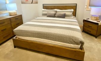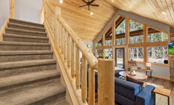 Step into an immaculate new cabin with an open-concept floor plan, soaring cedar ceilings, and a majestic floor-to-ceiling rock fireplace. Our spacious, fully stocked kitchen and great room are perfect for entertaining. The main bedroom features a king-sized bed and a private full bathroom, ensuring your comfort and privacy. The guest room, with a ¾ bath and laundry closet, is located on the main floor.