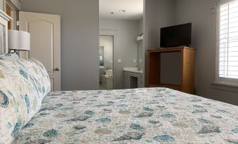 The master bedroom has a king sized bed with a large walk in closet. It also has an attached bathroom with privacy toilet, shower, vanities, and a jetted tub. The 2nd bedroom also has a king sized bed with an attached full bathroom. The 3rd bedroom has 2 queen beds with an attached bathroom. That bathroom is also accessible from the hallway.