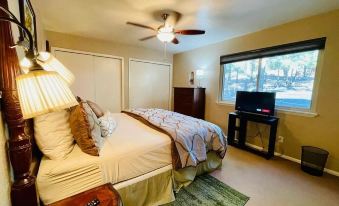Main level floor comes with three bedrooms: The Master Suite features a king size bed, two nightstands with reading lamps, and an armoire with TV (Netflix) you can watch from bed, in addition, the Master Suite comes with a large shower/tub combination, sink vanity for Him and Hers and a comfortable walk-in closet. Master suite has a sliding glass door to the deck so you can slip out and enjoy the fresh pine–scented air.