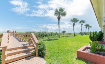 Seamless Living: The open-concept living area, merging kitchen, dining, and family rooms, is your space for making memories. Comfy seating, a large-screen TV, and views of palm trees and beach dunes create an ambiance of relaxed luxury. The back sliding glass doors open to a tile patio with outdoor seating and the lush grass yard. Only a few steps away from the boardwalk that takes you straight to the beach.
