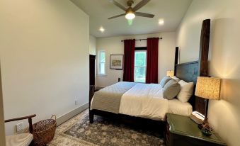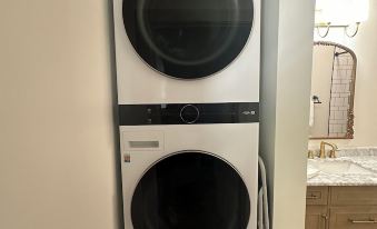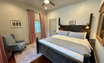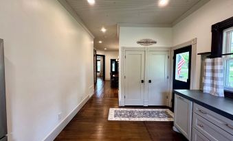 The quaint sun room off the front is for sipping morning coffee or curling up and reading a book. The original hardwood floors flow throughout the entire home. So many details are left from the original build that give the home character and warmth, while modern amenities make the spaces functional. An electronic keypad to unlock the door, remote control fans, bluetooth speakers, magnetic phone chargers and a smart thermostat. The hall bath is large and hosts a stackable washer and dryer. The first bedroom has a king size bed and armoire for clothing storage.