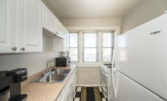 Thoughtfully designed to maximize efficiency and style. With just a few essential items, it features modern appliances, smart storage solutions, and an adjacent dining area, making meal preparation and dining a breeze. Despite its size, this kitchen and dining space add to the apartment's overall charm and functionality.