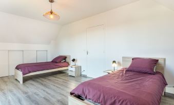 Large, beautiful single-family house "Bollevilla", built in 2021. 200 m from the centre of Bolleville, 2.6 km from the centre of La Haye, 28 km from the centre of Valognes, in the residential district, 8 km from the sea, 8 km from the beach. Private: property 600 m2 (fenced), parking (for 3 cars), single garage. Shop 2.6 km, supermarket 2.6 km, bus stop "LA HAYE-DU-PUITS_Rue de Verdun" 3.4 km, sandy beach "portbail" 8 km. Golf course (18 hole) 15 km. Nearby attractions: portbail 8 km. "Bollevilla", 6-room house 165 m2 on 2 levels. Bright, modern furnishings: living/dining room with dining table and satellite TV. Exit to the terrace. 2 rooms, each room with 1 french bed (160 cm, length 200 cm). Open kitchen (oven, dishwasher, 3 induction hot plates, toaster, kettle, microwave, freezer, electric coffee machine) with small bar. Shower, sep. WC, double hand-basin. Upper floor: open living/sleeping room with sloping ceilings with 1 sofabed and satellite TV. 1 room with 1 french bed (160 cm, length 200 cm). 2 rooms, each room with 2 beds. Shower, sep. WC, double hand-basin. Electric heating. Parquet floors. Terrace furniture, box-room. Facilities: washing machine, dryer. Internet (WiFi). Please note: non-smoking house. Maximum 2 pets/ dogs allowed. Smoke alarm.