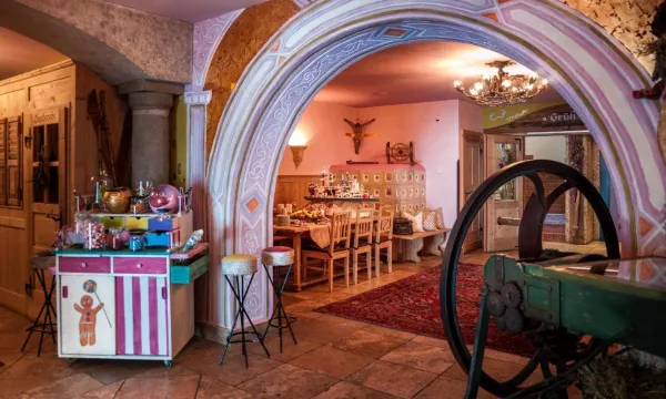 This is a very comfortable hotel with quirky interior, incredible food and lovely staff. We spent a week there for a ski holiday. It was the end of the season so we were nearly the only guests in the hotel which was a bit weird, but the staff made us feel extremely welcome and nothing was too much trouble. Especially Patrizia who was amazing. We were on half board - food is delicious - but we did tire of 5 courses every night and dining in the same place. Breakfast was great - buffet options plus cooked items on request. We opted for fondu one night which was delicious - had a slightly modern twist with curly chips, grapes and broccoli. The hotel has a rustic feel with hand painted interior touches. Its a 5 min walk to the ski lifts but there was always someone to drive us there if we wanted. We left our skis and boots at Jennewein Sports shop in their ski lockers, directly opposite the lifts. Cocktails were also excellent - we enjoyed Negronis by the fire after an afternoon' skiing. It would be nice to have a coffee machine and a sofa to sit on back in the room.