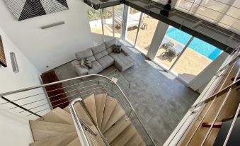 This south facing villa is a beautiful example of modern architecture and has 5 bedrooms and 4 bathrooms and comfortably accommodates up to 8 persons. This villa is deal for groups, families & couples who want a stylish and relaxed base from where to enjoy the island. The villa has a large open plan living area which is extremely spacious with sofas and high ceilings with a wooden & steel open staircase leading to the mezzanine level with office facilities and large bookcase. On the 1st floor there are 2 bedrooms and 2 bathrooms. The master suite on the 1st floor has a dressing room and open wardrobes, a large en-suite bathroom with walk in shower & bath and direct access to a balcony that overlooks the pool & garden. There is also a twin bedroom with balcony on the 1st floor. The ground floor has a further double bedroom and bathroom and leads to a large, light and airy modern kitchen/dining area and the TV room with 60 inch LED smart TV with SKY TV freeview, Netflix & Prime Video. Through the TV room there are a further 2 bedrooms with a shared bathroom, this area is attached to the main house bust also has a separate entrance which is ideal for privacy. This property is stylishly designed with a mixture of wooden and microcement floors and air conditioning throughout and is tastefully decorated in a modern European/Asian style. There is a stone BBQ on the well-kept grassed gardens and the pool terrace is spacious with sun-beds and large day-bed. There is also a large table that is ideal for al-fresco dining. The villa is deep cleaned by our expert team with specialist cleaning products before arrival/after departure and offers a safe & secure base to which explore this beautiful island.About pets:No pets allowed.About checkOut:Check out before 10:00 AM.About children:Children allowed: ages 0-17.Cot & high chair available free of charge.About checkIn:Check in after 4:00 PM.About smoking:Smoking is not permitted.Smoking outside only.About minBookingAge:Minimum age to rent: 25.About events:No events allowed.