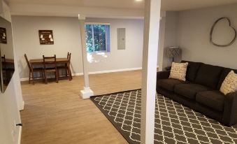 Upon entering the unit through a private entrance there is a living room with a queen size sofa bed, dining table, desk, custom made wet bar, fridge, microwave, coffee maker and large flat screen smart TV. Past the living room and towards the back of the unit is a large carpeted bedroom with a queen size bed, desk, dresser, and large flat screen TV. Connecting the bedroom and living room is the bathroom. WiFi is available throughout the unit.