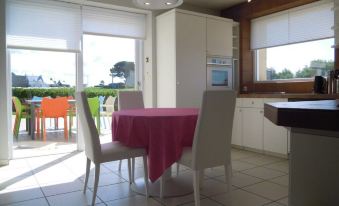 Un accueil par la propriétaire époustouflant: cidre et crêpes au frigo, pommes de terre et oignon au garage, 3 bouquets de fleurs dans la maison et puis, quelle vue et aussi bien du salon, de la table à manger et même de la cuisine avec toutes les chambres sauf une qui donnent sur la mer!Aucune mauvaise surprise, tout est compris, linge de lit, serviette de bain et de plage, nettoyage final.La maison est spacieuse avec une cuisine bien équipée, une salle de jeu à l'étage équipée d'un billard pour les jours de pluie, 4 ou 5 vélos de différentes taille à disposition, un énorme espace de jeu en pelouse devant la maison et bien sûr un accès à la plage via le sentier du littoral. Boulangerie et petit magasin dans le bourg à 1,5km. Bref vous l'aurez compris, si vous êtes arrivés jusqu'ici, croyez-moi, n'allez pas plus loin, vous avez trouvé la perle rare au rapport qualité prix imbattable!(PS: Les photos sur le site sont parfaitement conformes à la réalité)
