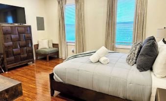 - The master bedroom features a queen-size bed with quality linens, room darkening curtains, a closet, a five-drawer dresser, and a luggage rack. It also includes a smart TV with streaming apps, bedside charging ports, a ceiling fan with dimmable lights, and a small mirrored vanity.