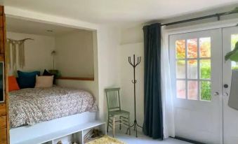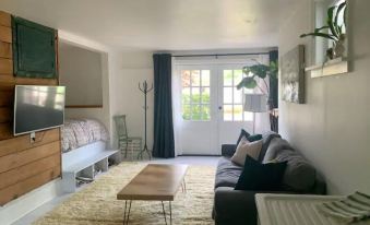 Keeping with the history of our 1926 home, we restored and retained many of the original pieces of this space, our guest suite is a mix of vintage and modern with the original kitchen sink and cabinets, exposed wood walls and metal fire doors, but we also brought in modern and eco-friendly updates with a marble walk-in shower and pump toilet. You will also find eco-friendly touches such as filtered water faucet, reusable dishes and soap dispensers for your use. This is a studio space with kitchenette and living room area. There is a queen bed with way too many pillows and 800 thread count sheets, a couch, a smart TV and Wifi. Double French doors open up to a tiny outdoor seating area (too small to call a patio but perhaps worthy of your morning coffee moment.)