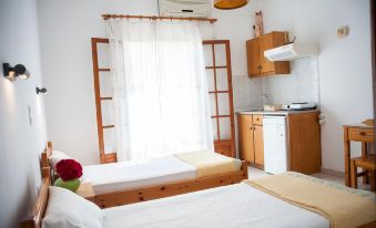 Nikos and Stella run these apartments and are the most welcoming couple you could wish to meet.The apartments are basic as are many in the islands but clean and the beds comfortable.Three of the rooms overlook the main road and get the sun on the small balconies all day.They are opposite the Drunken sailor bar which affords you free entertainment each night,tribute acts etc.There are quieter rooms at the side and rear.If you are given to eating in, they lack facilities in that department,a two ring electric hob and a kettle.The complex has a lovely pool with plenty of sunbeds and a nice poolbar run by the hosts providing a variety of drinks and choice of food.The hosts are more than willing to help in any way they can and provide you with whatever you require within reason.There is aircon in the room at a cost of 6 Euros a night if you need it,we didn't.This is a budget holiday at a budget price so do not expect frills,but Nikos and Stella are two lovely people who always aim to please.